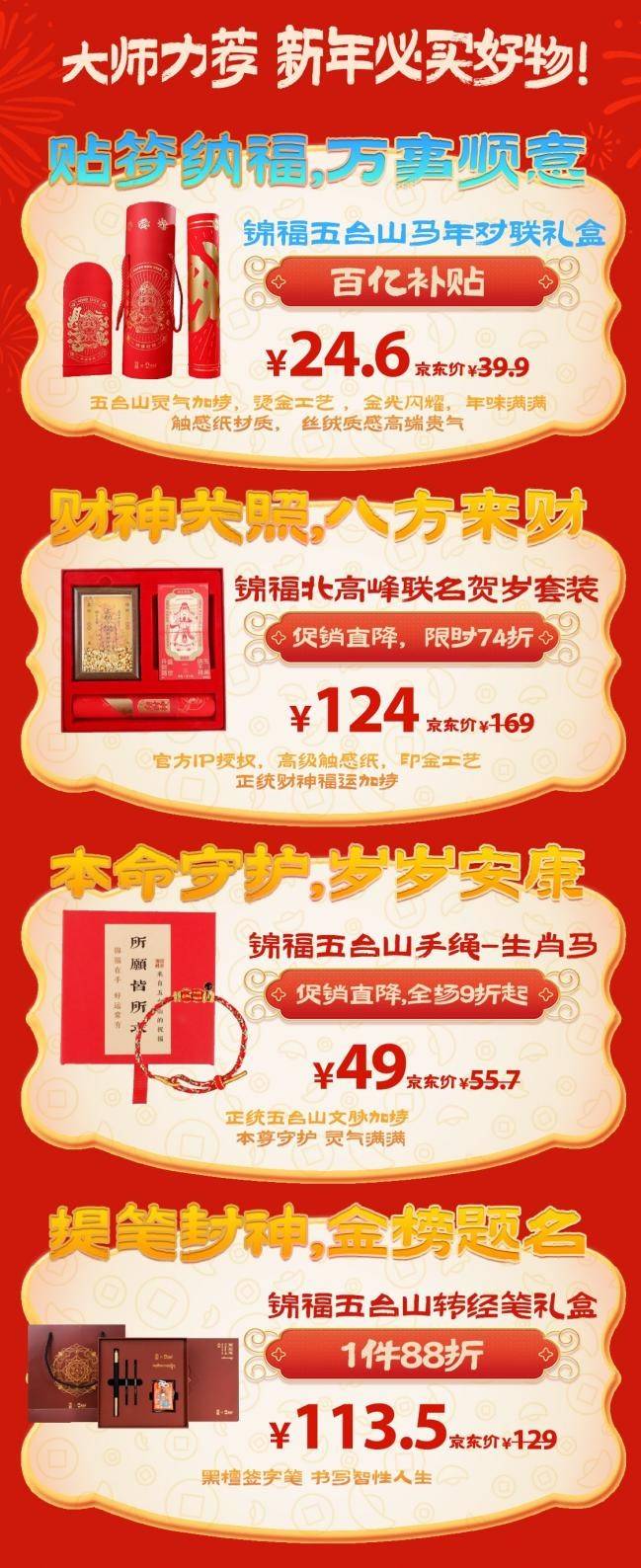 在挥毫送福、传递美好祝愿之余,书法大师同步推荐了多款蕴含福运的新年必买好物。锦福五台山马年对联礼盒,采用烫金工艺打造金光闪耀的视觉效果,触感纸材质带来高端丝绒质感,年味与质感兼备,百亿补贴价24.6元。锦福北高峰联名贺岁套装拥有官方IP授权,高级触感纸搭配印金工艺,拥有正统财神福运加持,享限时74折优惠,到手价124元。锦福五台山手绳-生肖马,以正统五台山文脉为依托,为佩戴者带来满满的灵气与守护,享全场9折优惠后49元即可入手。锦福五台山转经笔礼盒,黑檀木签字笔质感出众,寄寓书写智性人生的美好祝愿,享1件88折,到手价113.5元。