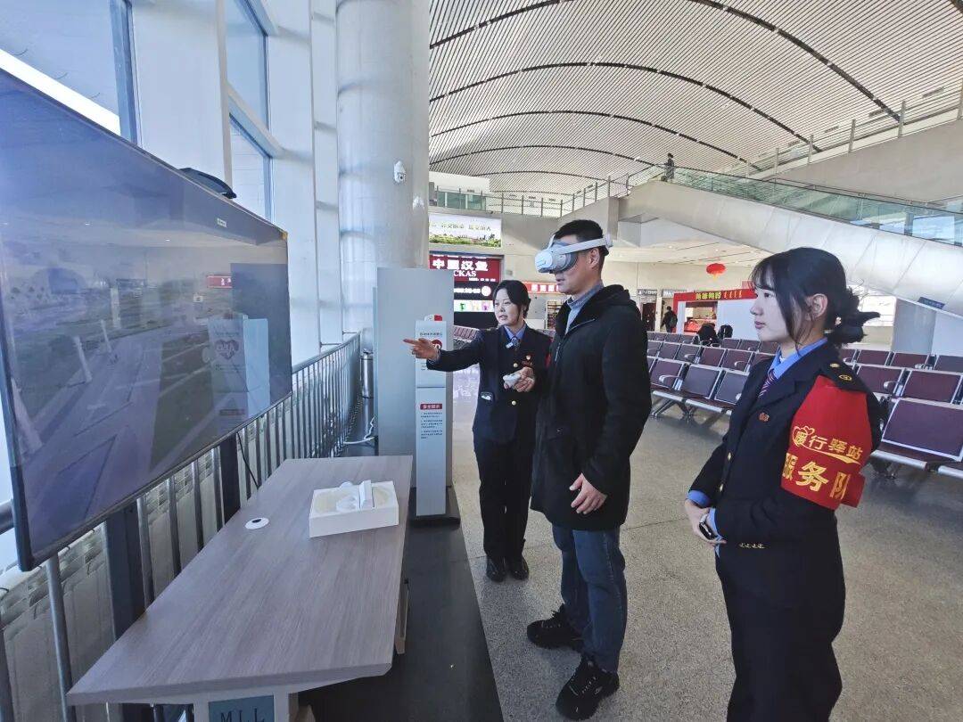 旅客在鄂尔多斯站可以通过VR设备实现车站漫游,直观了解暖心服务举措、出行注意事项,并且足不出站就能身临其境感受鄂尔多斯周边旅游景点,为旅客规划行程提供参考。乌海站、巴彦淖尔站、乌兰察布站、锡林浩特站、二连站、大板站在站房进出口配备热风幕、防寒门帘,使候车室保持在舒适温度;积极协调运管和公交部门,动态增加列车到站集束时段出租车、网约车运能配给和公交接驳班次,优化社会车辆停靠区域,服务好旅客出行“最后一公里”。春运期间,草原铁路各站共组织182名春运志愿者投入到春运一线,为旅客提供信息咨询、客流引导、设备使用协助、文明宣传等服务,在春运现场展示青春风采。